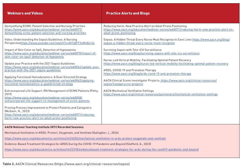 The American Association of Critical Care Nurses (AACN) has a webpage dedicated to sepsis. There is a plethora of resources to guide the nursing care of critically ill patients with sepsis, septic shock, and ARDS. These include but are not limited to practice alerts, webinars, blogs, and National Teaching Institute (NTI) recordings (Table 2). AACN also offers the opportunity for nurses to validate their specialty knowledge by earning micro-credentials for sepsis, ECMO, and COVID-19 Pulmonary and Ventilator Care. These micro-credentials are available for eligible applicants. More information about micro-credentials can be found at https://www.aacn.org/certification/micro-credentials