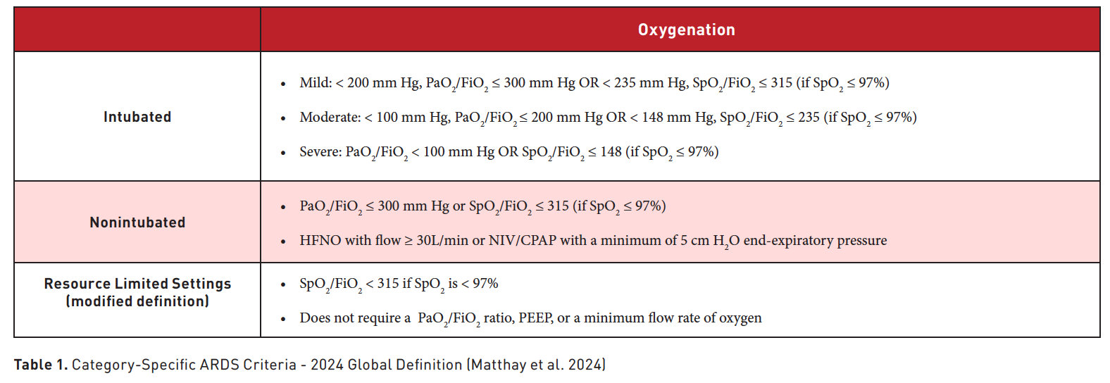 The 2024 Global Definition of ARDS recognises the 2012 Berlin Definition of ARDS, including risk factors and origin of oedema, timing, chest imaging, and severity of ARDS in intubated patients utilising positive end-expiratory pressure (PEEP) and the partial pressure of arterial oxygen/fraction of inspired oxygen (PaO2/FiO2) ratio. The global definition expands the criteria (Table 1) to include non-intubated patients with high-flow nasal oxygen (HFNO), continuous positive airway pressure (CPAP), and those in resource-limited settings, as well as utilisation of pulse oximetry to assess saturation of peripheral oxygenation (SpO2) and obtain a SpO2/FiO2 ratio when oximetry readings are < 97% (Matthay et al. 2024).