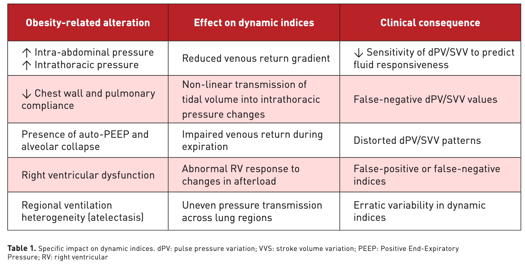 The pathophysiological changes associated with obesity significantly impact cardiopulmonary interactions. The increase in abdominal mass and thoracic fat elevates intra-abdominal pressure, which is transmitted to the thoracic cavity, resulting in a decreased venous return gradient (systemic filling pressure minus right atrial pressure), thereby compromising venous flow to the heart. The reduced compliance of the chest wall and pulmonary parenchyma leads to a non-linear relationship between tidal volume and intrathoracic pressure changes induced by mechanical ventilation. Additionally, right ventricular dysfunction renders the right heart more susceptible to afterload variations generated during mechanical ventilation, which in turn alters the cyclic stroke volume response (Hamahata et al. 2023; Berger et al. 2023). In summary, pressure transmission is no longer physiological, chronic impairment of venous return is present, and the right ventricle may not respond in the same manner as in a normoweight patient. Table 1 summarises the specific impact on dynamic indices.