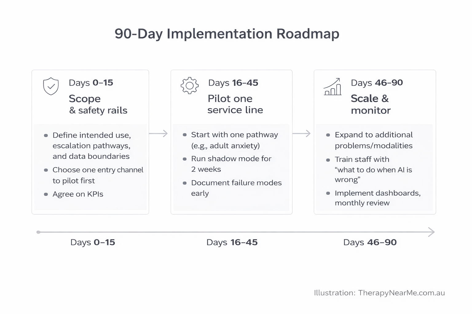AI can meaningfully improve access to mental-health services by strengthening the front door: structured intake, triage support, routing, and clinician workflow assistance. The organisations that benefit will be those that implement AI as governed decision support, with auditability, human oversight, and a measurable operational roadmap.